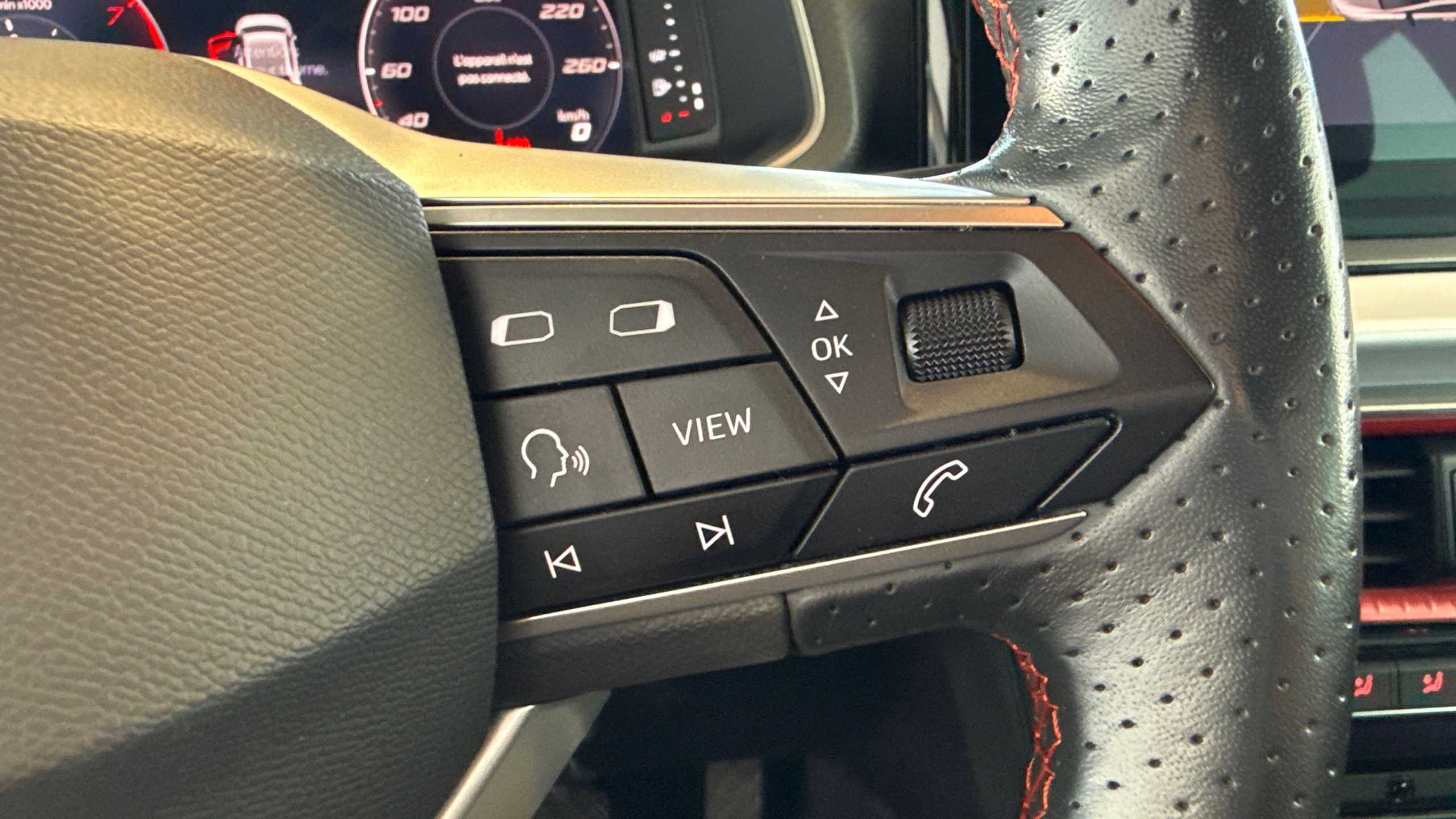 • Volant sport multifonctions à méplat en cuir Nappa perforé avec surpiqûres rouges et logo FR